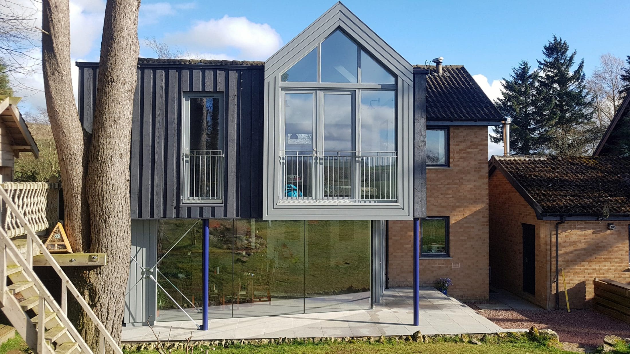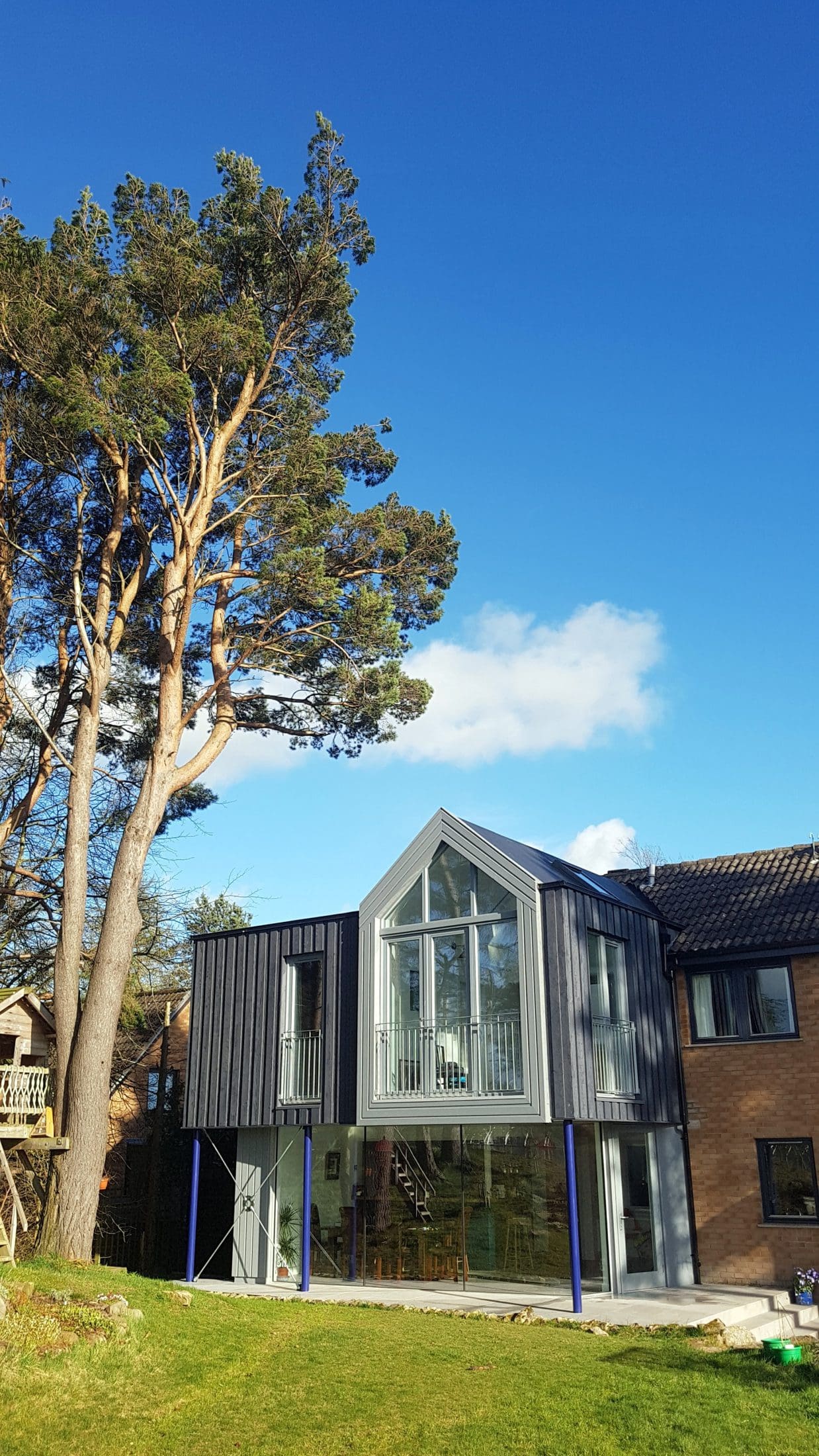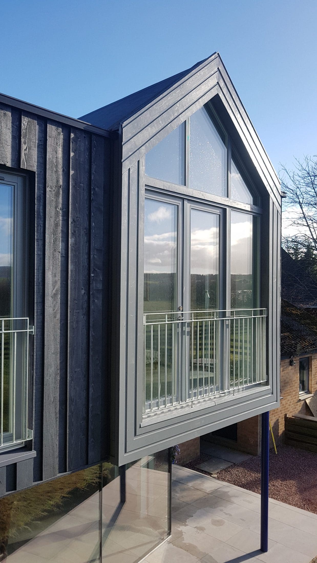 The first floor overhangs the ground floor glazing with the overhang being calculated to keep direct sunlight off the floor to ceiling glass in the summer months. It also provides some shelter from the Scottish weather should you wish to sit outside when it’s raining.