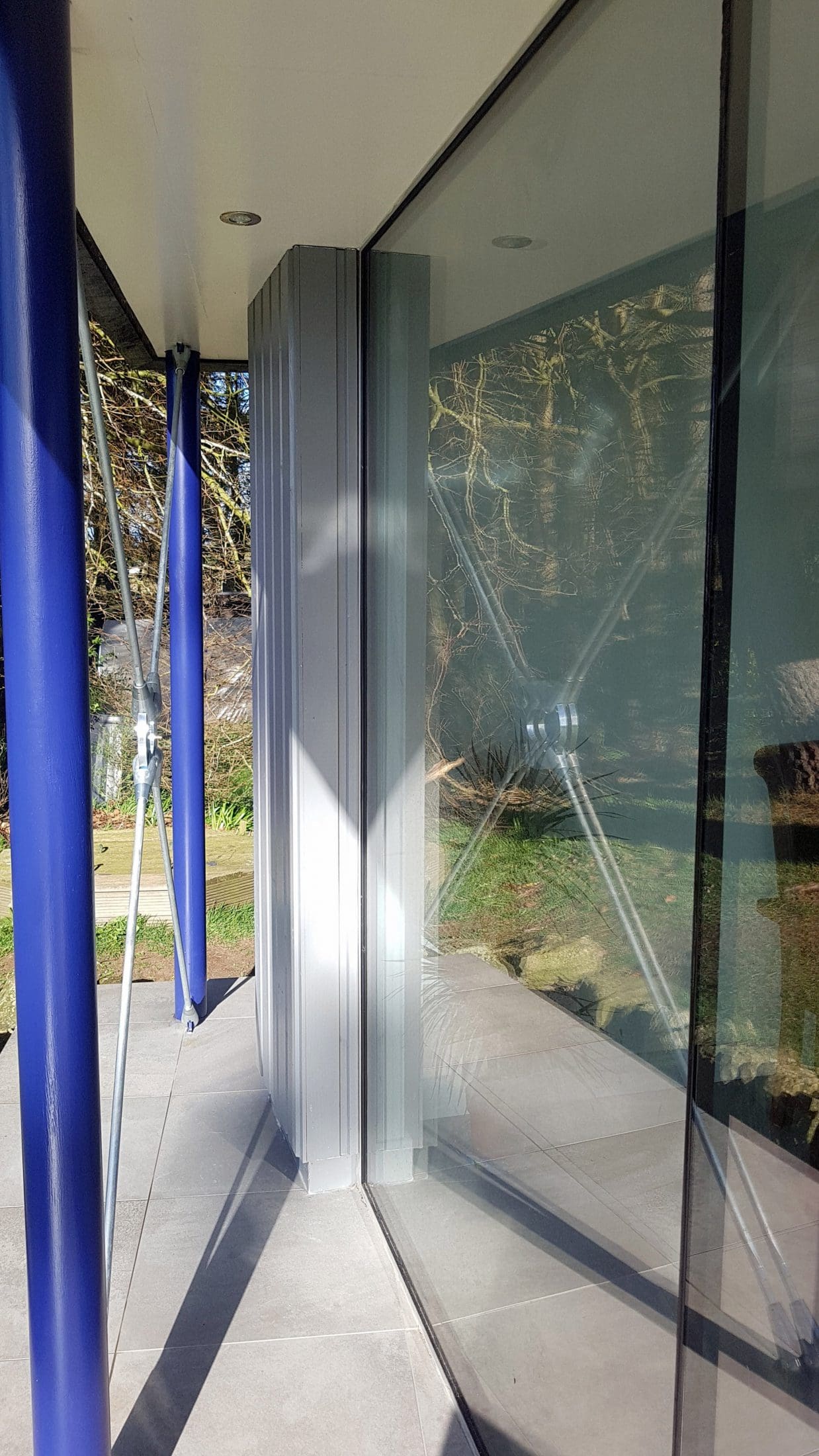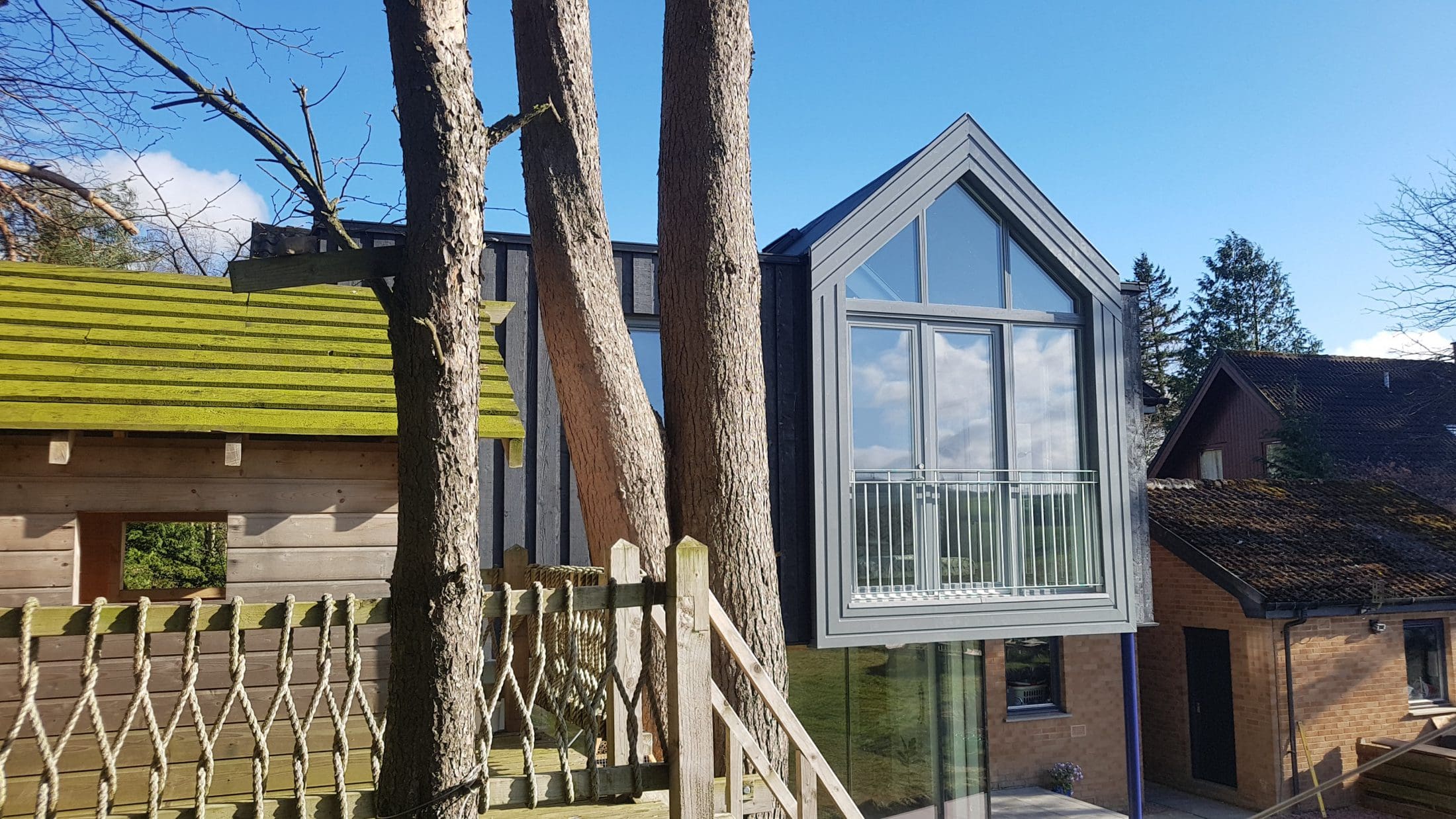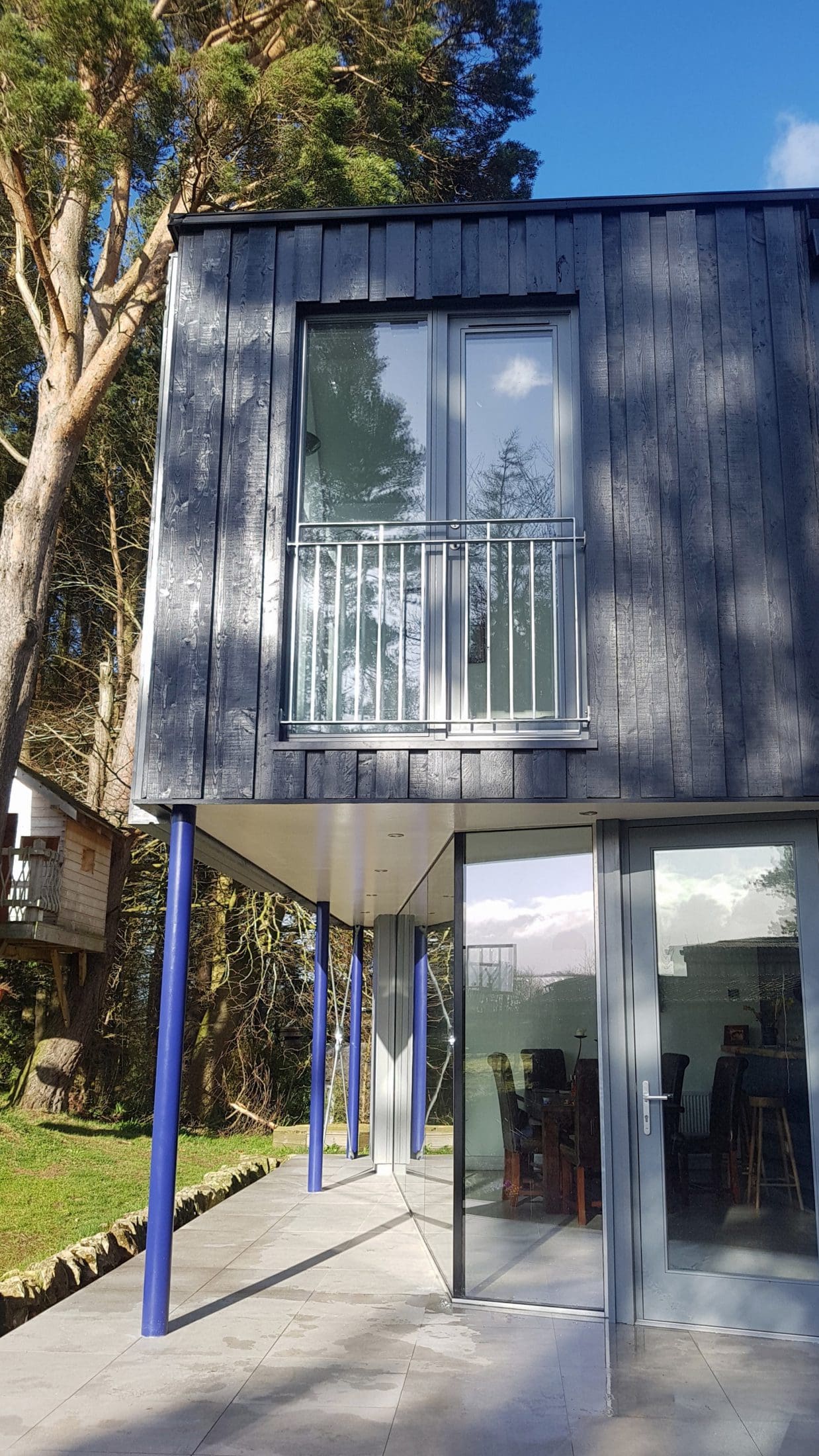 The first floor overhangs the ground floor glazing with the overhang being calculated to keep direct sunlight off the floor to ceiling glass in the summer months. It also provides some shelter from the Scottish weather should you wish to sit outside when it’s raining.